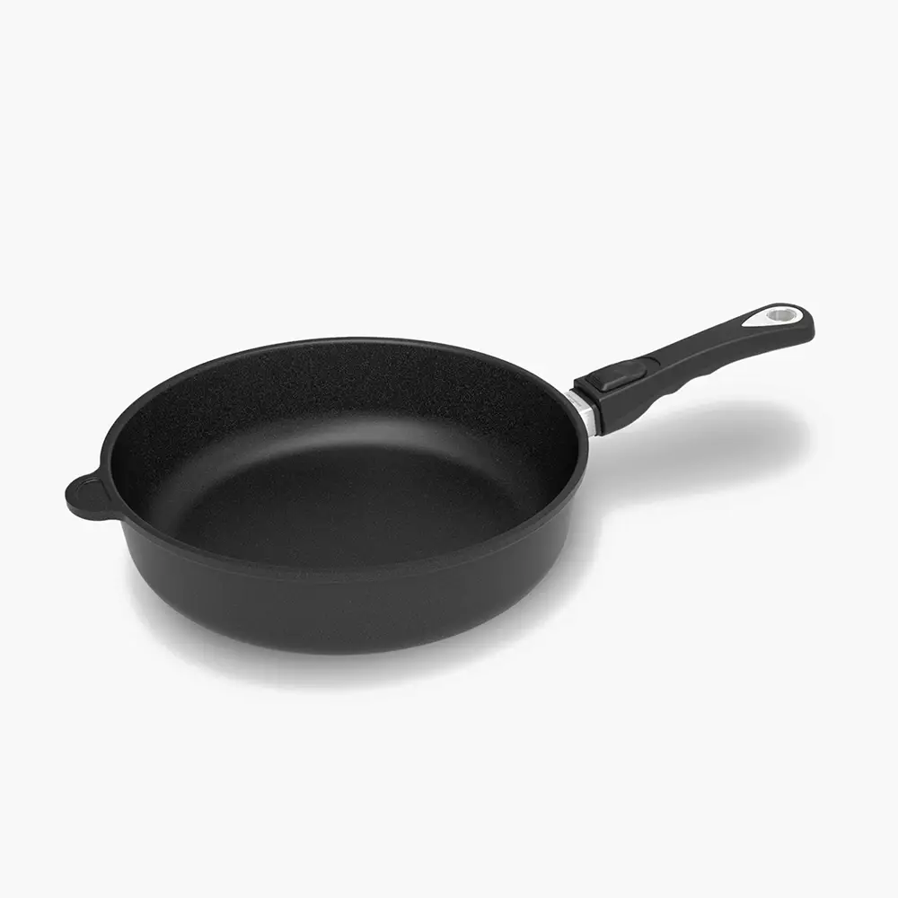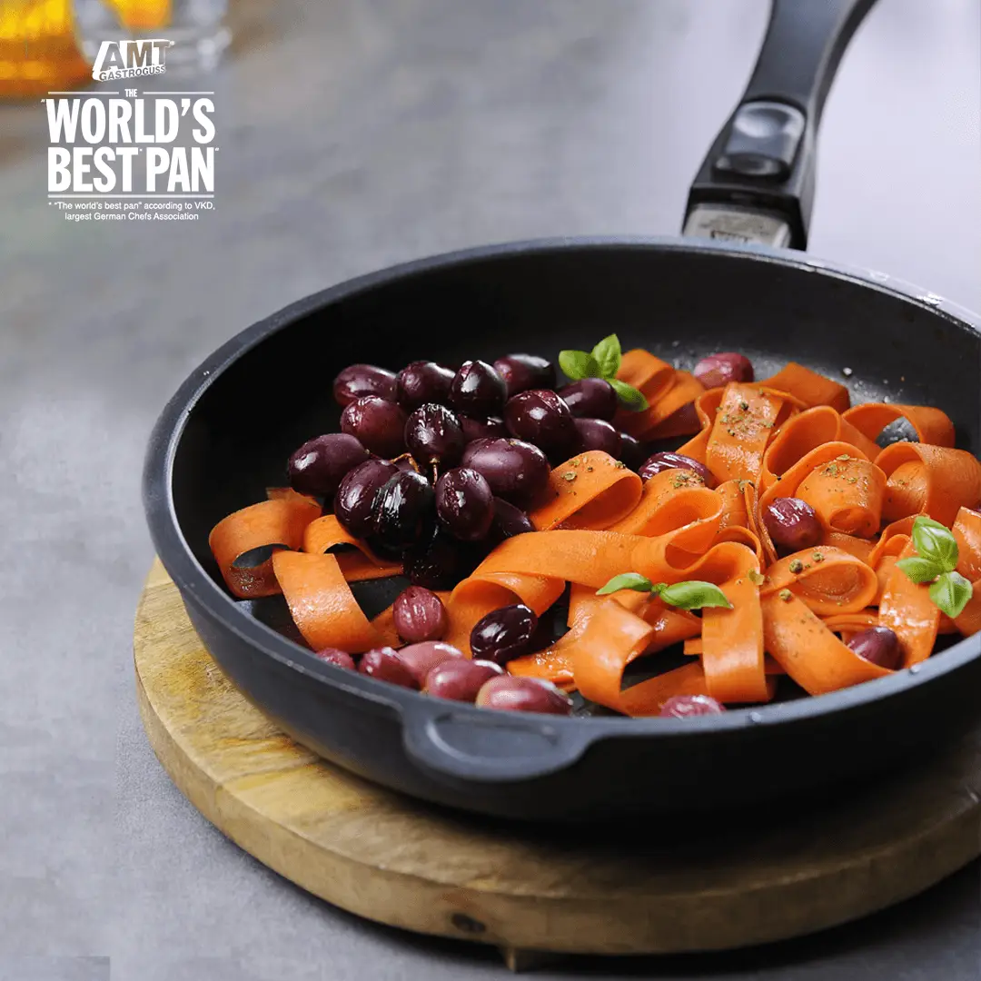 A deep frying pan with high walls, intended for simmering dishes. It can also be used for frying multi-ingredient dishes. Thanks to the 10mm thick base, the pan retains heat for longer, distributing it evenly over the surface of the entire pan – the stewing process takes up to 20% shorter, allowing to preserve more nutrients in the prepared meals. Ergonomic shape ensures optimal steam circulation, thanks to which the food is soft and juicy. It is also covered with a Lotan® coating, allowing frying without the use of fat and quick washing without a large amount of detergent.