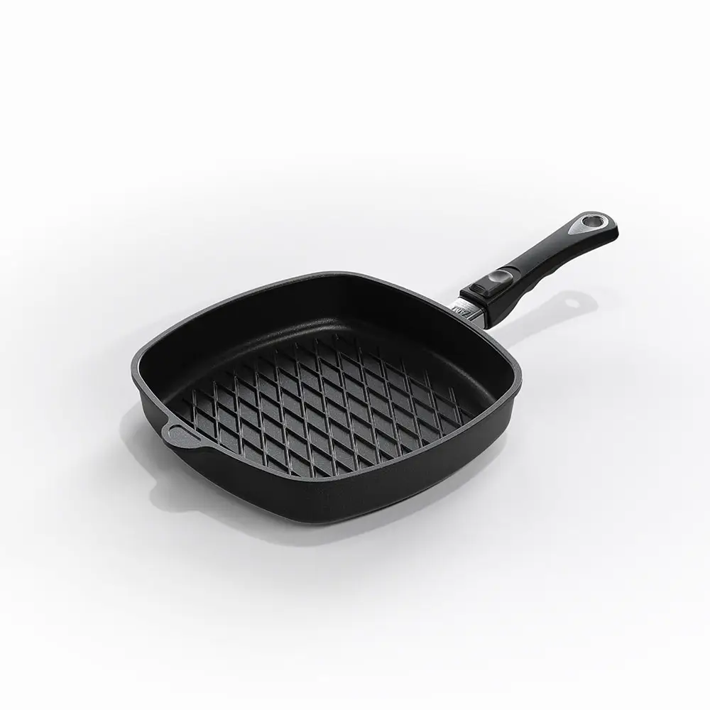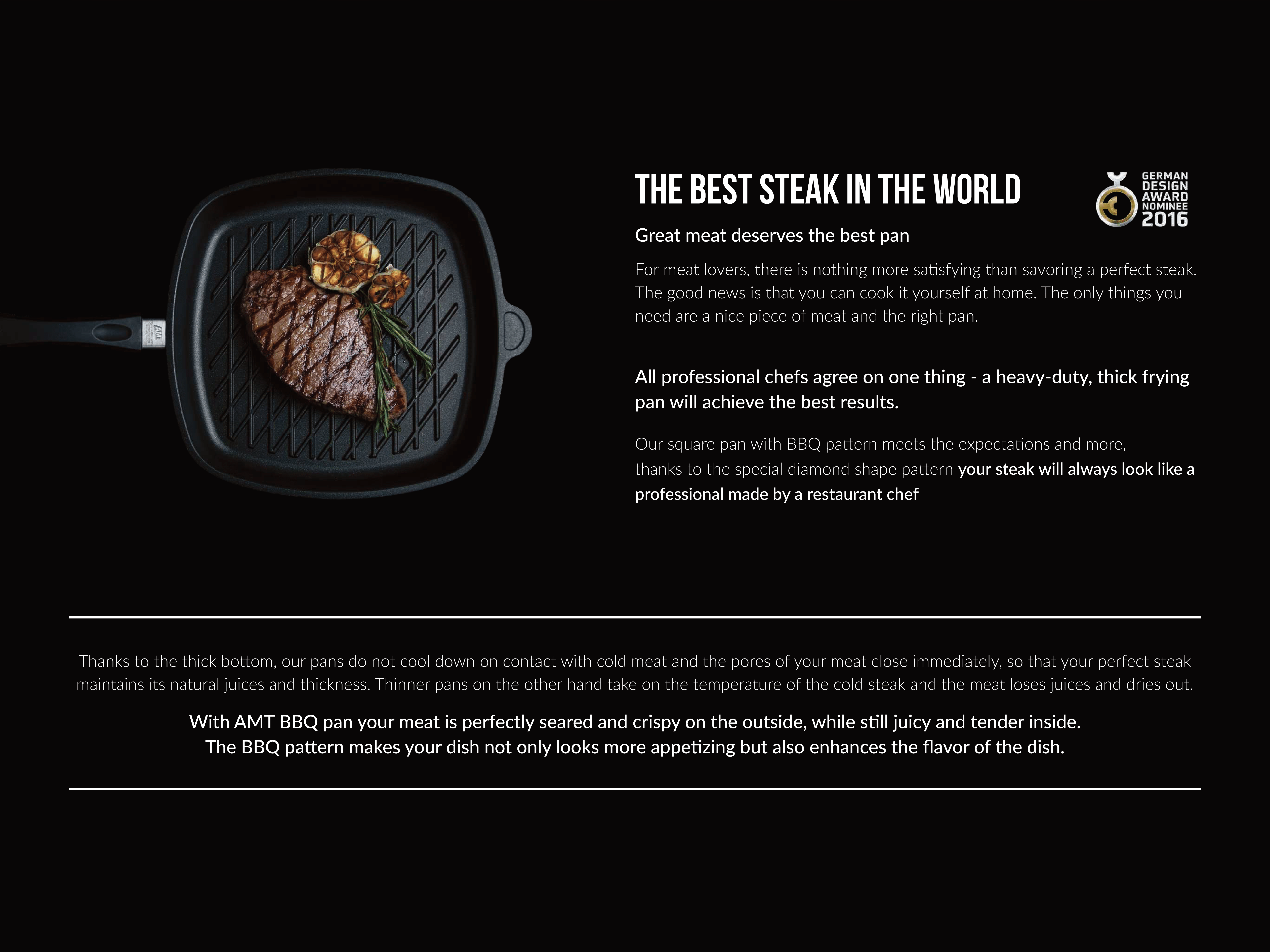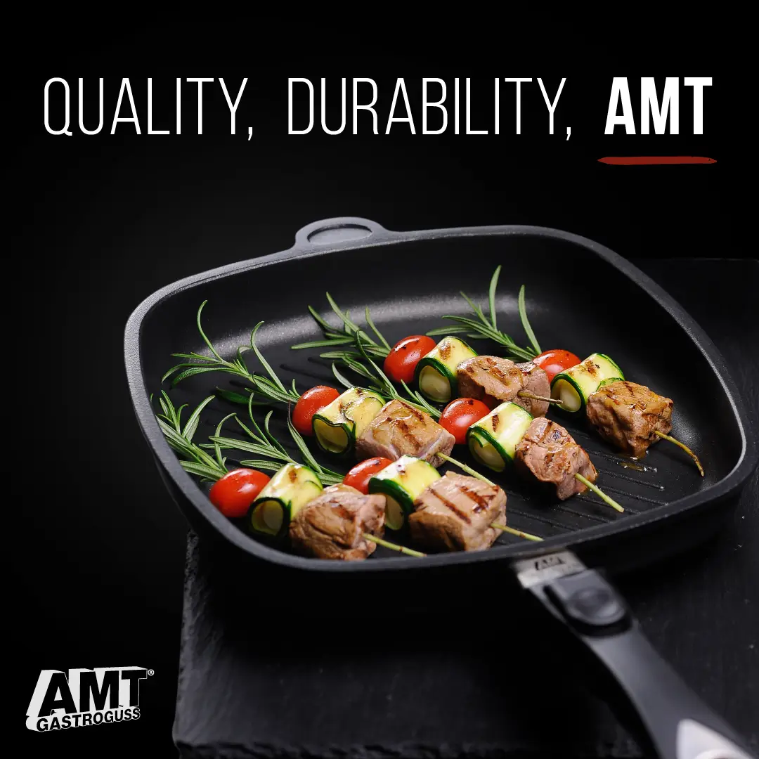 Pan with BBQ pattern, created with a perfectly well-done steak in mind. Non-stick Lotan® coating, allows to fry without oil. In contact with the evenly heated pan, the pores of the meat close immediately, keeping it naturally juicy and thick. The steak is perfectly fried and browned on the outside, yet tender on the inside. The AMT BBQ pan will also be perfect for preparing fish and vegetables, enhancing flavour and preserving their nutritional values thanks to the faster frying. The diamond pattern – available only in the AMT offer – will make the dishes look unique and appetising.