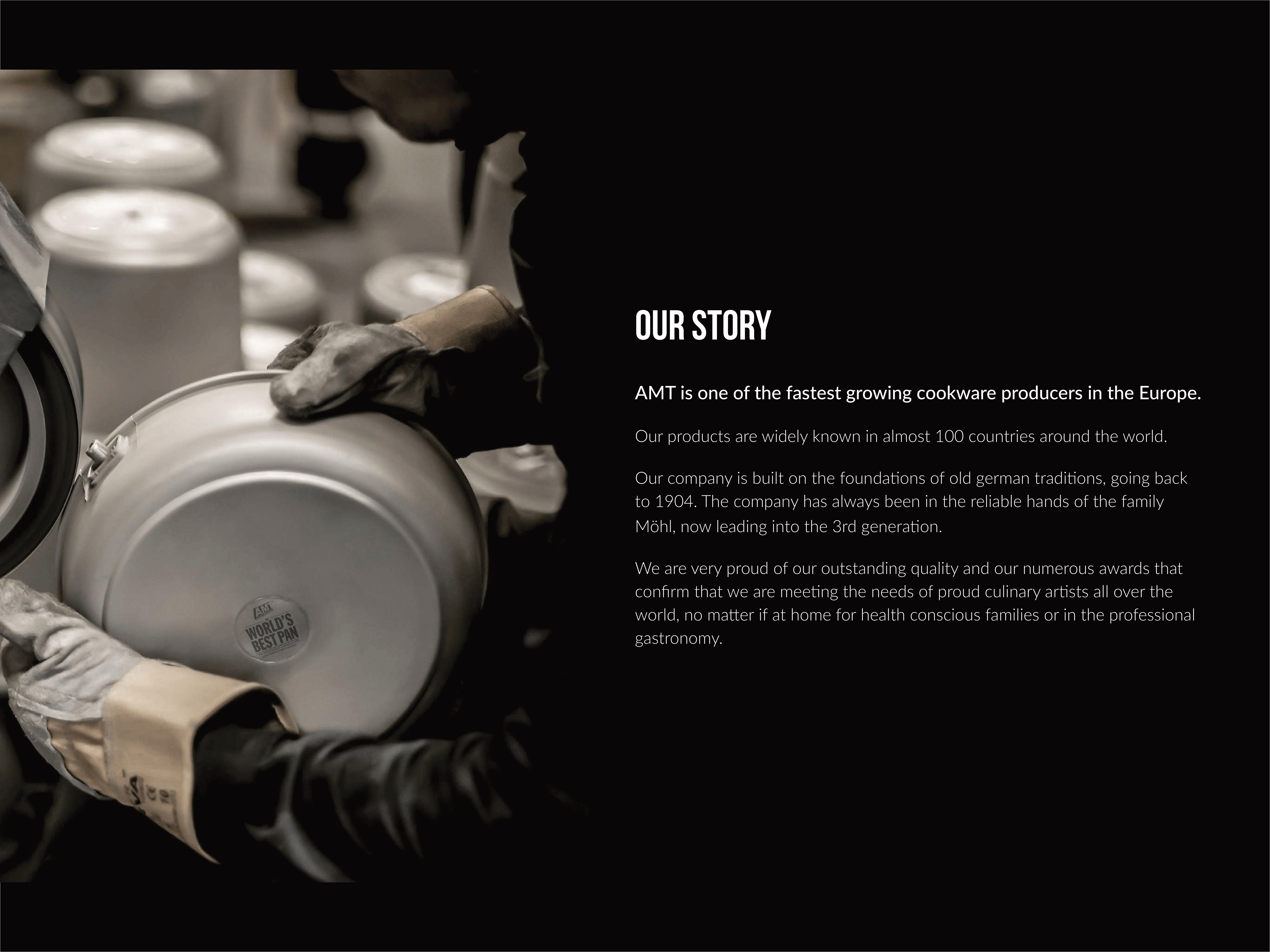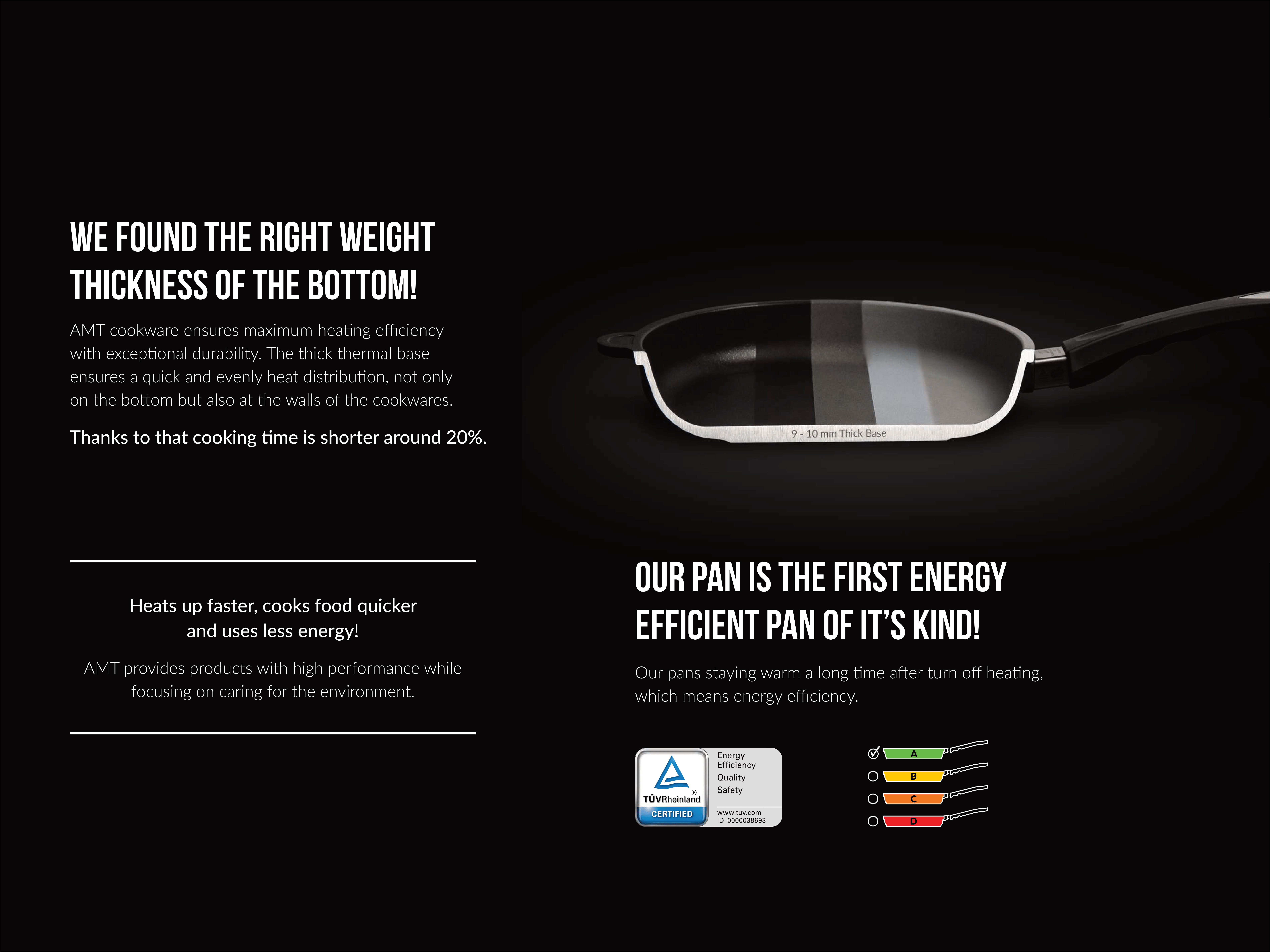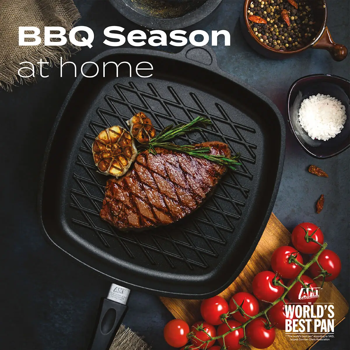 Pan with BBQ pattern, created with a perfectly well-done steak in mind. Non-stick Lotan® coating, allows to fry without oil. In contact with the evenly heated pan, the pores of the meat close immediately, keeping it naturally juicy and thick. The steak is perfectly fried and browned on the outside, yet tender on the inside. The AMT BBQ pan will also be perfect for preparing fish and vegetables, enhancing flavour and preserving their nutritional values thanks to the faster frying. The diamond pattern – available only in the AMT offer – will make the dishes look unique and appetising.